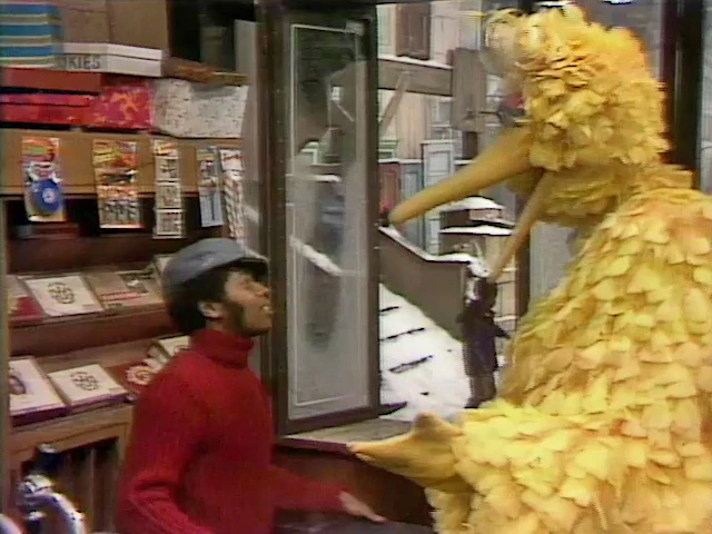 SCENE 7 | Big Bird and David enjoy the beauty of the snow from inside Hooper's Store, but David notes that neither he nor anyone else on the streets seems to have found the time to shovel yet. Big Bird says he's going to round up a bunch of kids to get the shoveling done. |