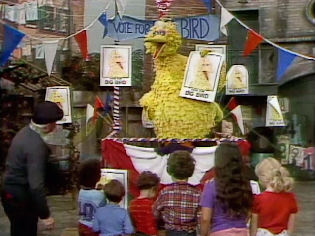 SCENE 3 | Big Bird has set up his campaign rally, offering free bags of birdseed to his constituents. The grown-ups approach him and inform him of how difficult being President is. Big Bird thinks he'd do just fine, so the others decide to role-play and imagine he's been elected President. President Bird starts declaring national holidays pertaining to birds, which don't receive much ovation. He then gets bogged down by the many problems his citizens have, from broken bats to dirty streets. He becomes even more frustrated when he learns he can't take a break and go roller skating. Big Bird decides to quit the race, but considers taking it up again when he's older. The grown-ups return to their radio broadcast, where they hear the President is taking his own roller skating break tomorrow. |