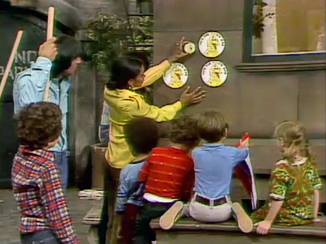 SCENE 4 | Maria, David, Luis and the kids sweep up the mess from Big Bird's rally and find some of his campaign buttons, which they use for a game of "One of These Things." |