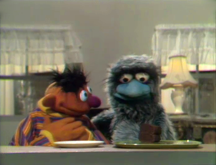 Muppets | Ernie and Bert: Ernie Eats Cake — Ernie eats one of the two pieces of chocolate cake that Bert was saving for their dessert. (First: Episode 0119) |