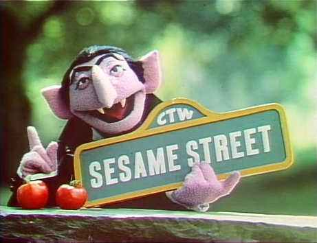 CLOSING SIGNS | The Count holds the Sesame Street sign, and Ernie and Bert hold the Children's Television Workshop sign. |