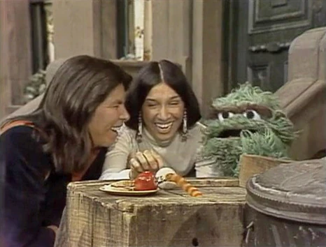 CLOSING SIGNS | Maria holds the Sesame Street sign, and Ernie and Bert hold the CTW sign. |