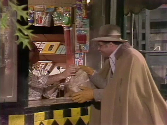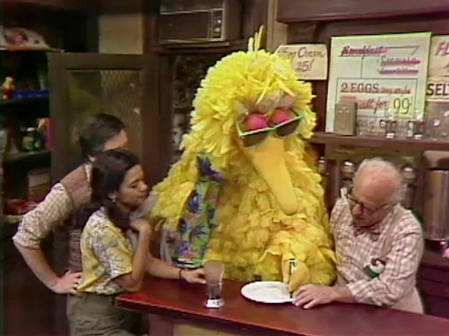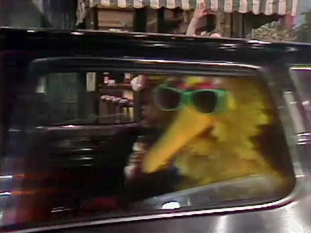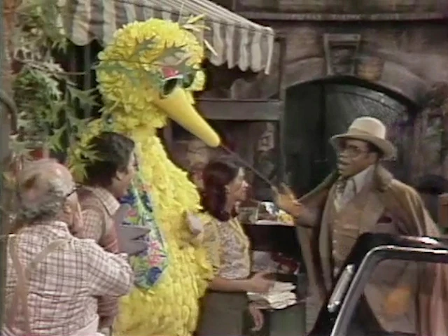 Over at Hooper's Store, Mr. Hooper tells his aunt in Chicago, a huge fan of James Earl Jones, about his visit over the phone. Big Bird enters, dressed as though he's a fashionable star and acts with an air of sophistication. The adults play along and act starstruck. Big Bird signs his autograph and makes his way to the door. He thinks his imagination has run away with him when he sees a limousine parked outside, but it turns out to be Jones's; he's returned to get another egg cream (this time, to go). As the adults all head inside with Jones, Big Bird gets in the limo and orders a drive, much to the shock of the driver (Richard Hunt making a cameo). | |