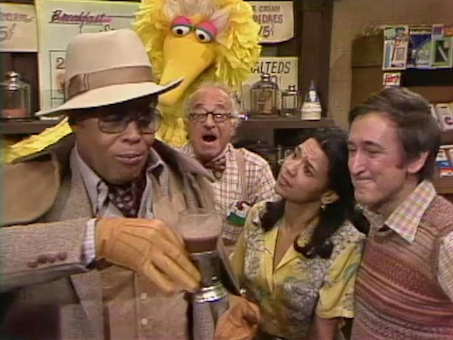 As he begins making the egg cream, Mr. Hooper realizes who the man is - famous movie star James Earl Jones. As he begins autographing a paper plate, Big Bird enters and is introduced to Jones, then learns what a movie star is. Before he can sample the egg cream, Maria and Bob rush in, star-struck. They all give him some space as he is about to sip, but now Mr. Hooper stops him. He thinks the egg cream has gone flat now and already has a fresh one prepared. Jones takes a sip and loves it ("Just as I used to drink as a kid," he notes). | |