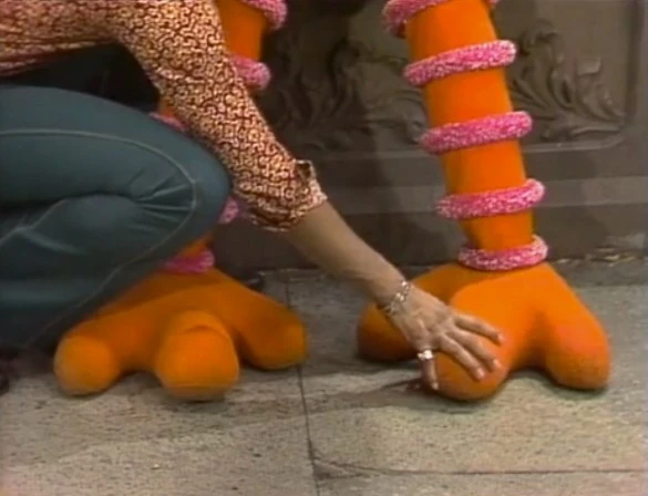 SCENE 2 | Gordon plays “This Little Piggy” with the kids near 123 Sesame Street. Big Bird wants to try it himself, but only has three toes on each foot. He is about to quit when Gordon tells him that not everybody is built the same; some people even have only one leg or one arm. He solves the problem by counting the toes on both feet; since there's an extra toe left over, they create a new “piggy” just for Big Bird. Gordon calls the extra piggy the one who "had a friend called Mr. Snuffleupagus," delighting Big Bird who tells a confused Olivia about his six piggies. |