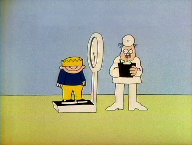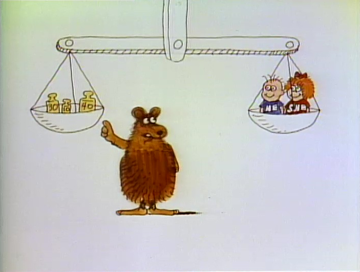 Cartoon | Heavy and light characters are weighed on a scale. (First: Episode 0843) |