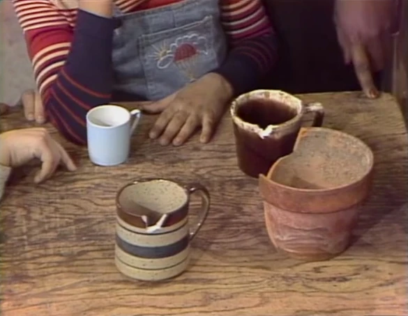 SCENE 4 | Olivia, Oscar, and the kids play a “Three of These Things” game with some of Oscar's belongings: two cracked cups, one small complete cup, and a cracked flowerpot. The kids guess the flowerpot doesn’t belong, and one kid points out how one of the items isn't chipped. Oscar explains why he uses all of them: he uses the cracked cups and flowerpot to drink his mud throughout the day, but he uses the small cup for his bedtime treat of olive oil and ketchup, admitting, "You just can't have too much of a good thing!" |