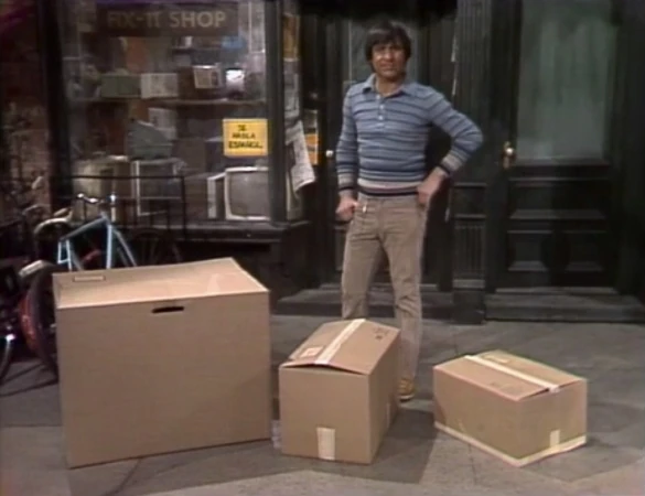 SCENE 3 | At the Fix-it Shop, Luis finds a delivery of three boxes of different sizes, though he only recalls ordering two things. He notices the smallest box is heavy and opens it up: it's a typewriter for Mrs. Gonzales. The middle box is heavier, and contains a sewing machine for Mr. Geiss. Luis assumes that the biggest box must be the heaviest, so he uses all his might to lift it. To his surprise the box isn't heavy at all, and thousands of feathers pour out onto him as he hoists the box into the air. He grimaces at Big Bird when he comes along, wondering if his shipment of feathers for his nest has come in yet. |