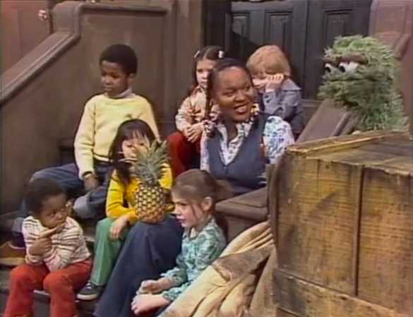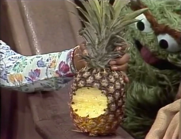 SCENE 3 | Olivia shows the kids what a pineapple looks like; Oscar says it looks more like a Grouch basketball. He prefers the rough outside and is disgusted by the sweet fruit on the inside when Olivia shares some pineapple slices with the group. When they're not looking, Oscar takes the whole pineapple and bites into it, finding it more fun than eating a cactus. |