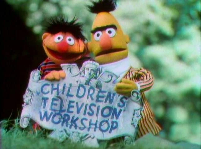 CLOSING SIGNS | The Count holds the Sesame Street sign, and Ernie and Bert hold the Children's Television Workshop sign. |