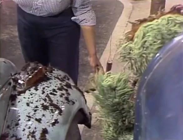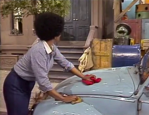 SCENE 5 | Oscar shows up to help out with Susan's car, despite her not wanting or needing it. She finds his helpfulness very out of character and discovers that Oscar has splattered mud on the side of her newly-waxed car. Since Susan likes cleaning and Oscar likes messing things up, he figures now both of them can have fun! Susan breaks down and calls for help from the others who lock horns with Oscar as Mr. Hooper announces the sponsors. |