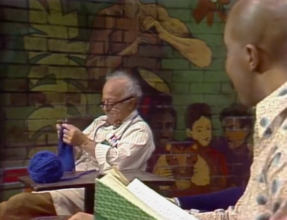 SCENE 2 | Bob and Gordon sit in the yard together, each reading books. Bob sees Big Bird reading from afar, and strikes up a conversation with Gordon on how good it is to see him trying new things at his age. Gordon agrees, but in Gordon's mind he thinks Bob is referring to Mr. Hooper, who sits nearby knitting something. |