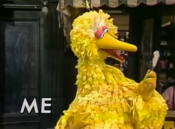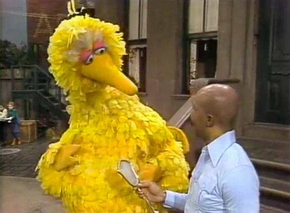 SCENE 2 | Big Bird has a new mirror, in which he can see "me" (himself). He shows it to Mr. Hooper, who sees "me" too. Big Bird takes this to mean that Mr. Hooper can somehow see Big Bird's image in the mirror, guessing it must be magic. He shows it to Maria, who clarifies the difference between saying "me" and "you." Big Bird then brings the mirror to Gordon and assumes he'll see "me" in the mirror too, but Gordon asks why he would see Big Bird's image rather than his own. Big Bird tries to explain what he just learned, but gets his pronouns all mixed up and leaves in a flustered mess. |