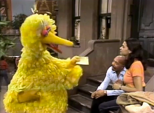 SCENE 4 | Big Bird excitedly shows Maria and Gordon the letter he got in the mail today. He explains that he entered the Bird Seed Toasties cereal drawing contest and the winner will be announced soon; he's sure that his letter will declare him the winner. Gordon and Maria open the letter and read it aloud, announcing one Isabelle Schultz as the winner instead. Big Bird is devastated and goes back to his nest in tears. Maria comes over to comfort him and tells him even if he loses a drawing contest, he shouldn't give up drawing. Big Bird admits that he's still sad about losing the contest, but feels a little better thanks to Maria. |