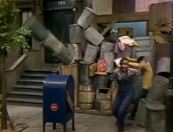 SCENE 1 | Olivia and David discover Oscar is building a new high-rise apartment complex for Grouches - Grouch Towers, a stack of various trash cans centered around his own. He handles calls from potential tenants when Olivia points out that unless he's gotten permission from the city to build this structure, it'll have to be torn down. Oscar is delighted by this revelation: "I was hopin' you'd say that!" He signals his crew to knock everything down before heading back inside his can for safety. Olivia and David run for cover as the extra cans immediately tumble down onto Sesame Street... which Oscar reveals was his plan all along for a big mess! |