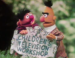 CLOSING SIGNS | Maria holds the Sesame Street sign, and Ernie and Bert hold the Children's Television Workshop sign. |
