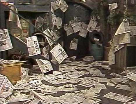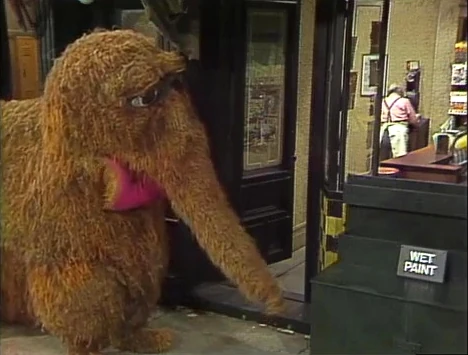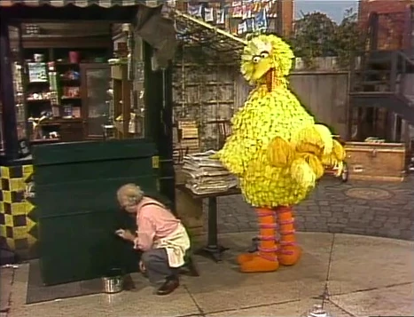 SCENE 2 | Mr. Hooper gives his newsstand a fresh coat of paint (stacking all the newspapers on a nearby table) and asks Big Bird to make sure people steer clear of the wet paint while he tends to a phone call. Mr. Snuffleupagus then happens by and offers to dry the paint quickly by blowing on it. When Mr. Hooper returns, Big Bird explains the situation - Snuffy was able to dry the paint, but now all the newspapers have been blown all over the yard. |