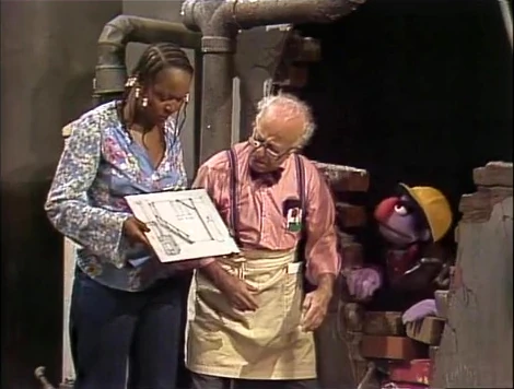 SCENE 4 | Mr. Hooper and Olivia go into the basement of Hooper's Store, where a large hole has been put in the wall. Biff, supervising the construction, explains that they're building a new subway tunnel through the area. He hands Olivia the blueprints, which perfectly match the store's basement. However, it's also revealed that the crew received directions from Big Bird, who mistakenly confirmed that the plans to build under Mr. Looper's store on Sassafras Street meant to build under Mr. Hooper's store instead. Biff calls for Sully to halt the subway train that is currently on the tracks that have already been laid down, and hastily begins to reassemble the bricks back into place. |