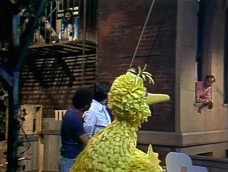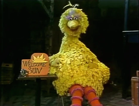 SCENE 4 | Big Bird's alarm wakes him up and he preps his "Welcome Sun" routine, but doesn't see the sun at all. He gets upset, when the sun starts to rise after all. He greets it with a song ("Good Morning, Mister Sun"). Maria comes outside to check on him and Big Bird wonders what he'll do with the rest of his day, but falls back asleep within moments. |