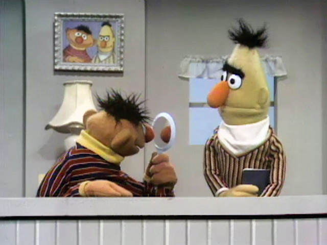 Muppets | Ernie and Bert: Here or Not Here β Bert is reading a book when Ernie startles him by asking if he wants to play checkers. (First: Episode 0171) |