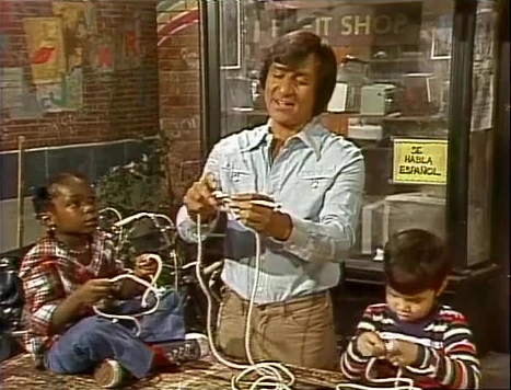 SCENE 1 | Luis shows Big Bird, Sharmaine, and Jeff how to tie a square knot using ropes, demonstrating "over," "under," and "through." Big Bird then asks how to untie a knot, having knotted himself up. |