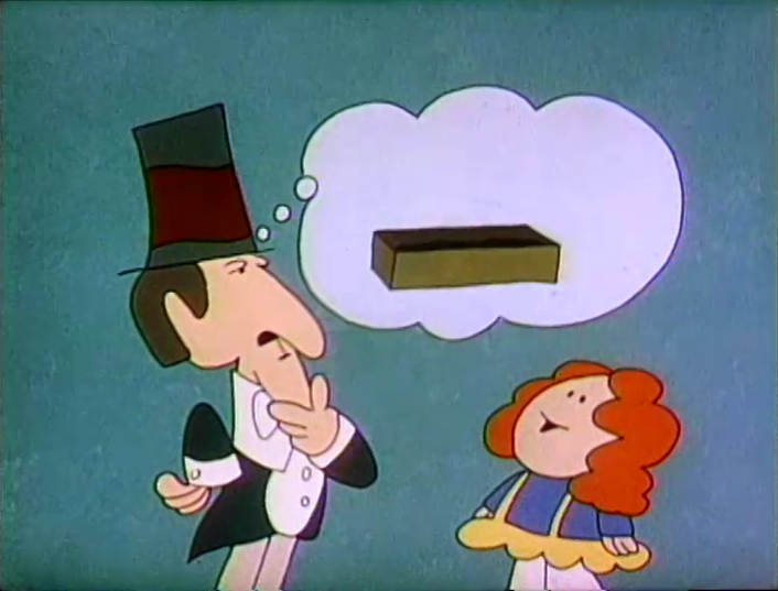 Cartoon | A top-hatted man tries to show a girl how many uses a box has, but she prefers kicking it. (First: Episode 0763) |