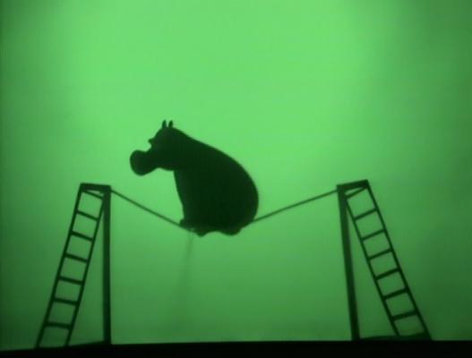 | Richard performs shadow puppetry. In the first act, an ostrich slides down a slide, then a mouse. When a hippo climbs up the ladder, he breaks the slide. | |