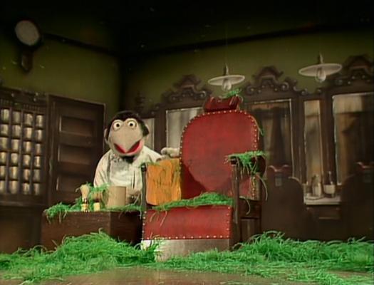 They chuckle. The hairy creature has gotten smaller. The barber continues working on him.