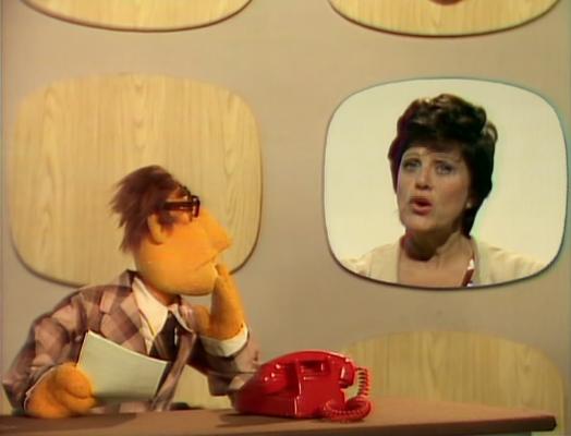 Here's a Muppet news flash. (runs to the desk) Dateline, Boston, Massachusetts. Mrs. Gretchen Powers of that city is trying to enter the Guinness Book of Records by completing the world's longest sentence. She began talking six weeks ago and neighbors say she hasn't stopped since. Our Muppet cameras are in her home now. Uh, Mrs. Powers?