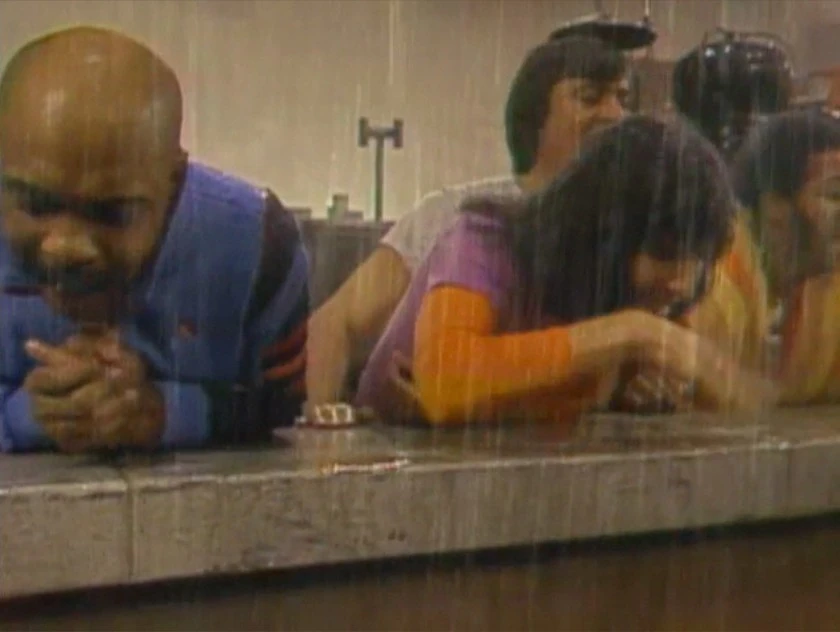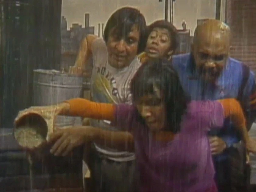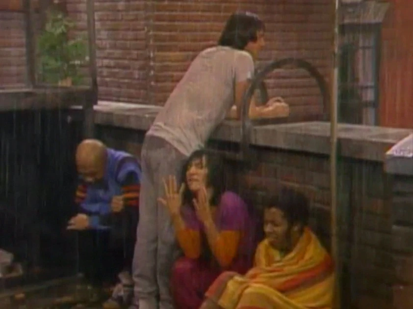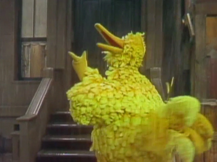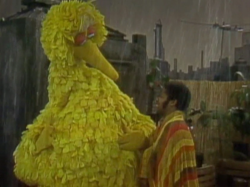 SCENE 8 | Clinging to their last bit of hope, Luis starts singing a little Spanish rain song. Then, Big Bird finally appears and the adults rush through the door, locking Big Bird on the roof. David returns for him. |