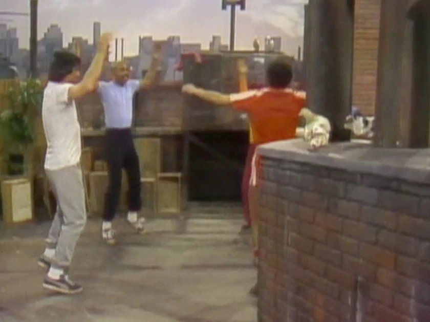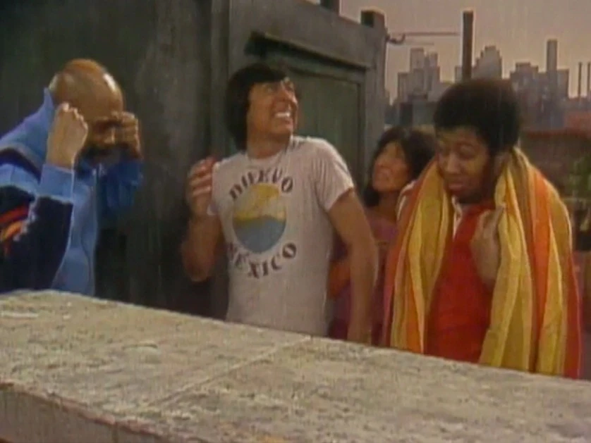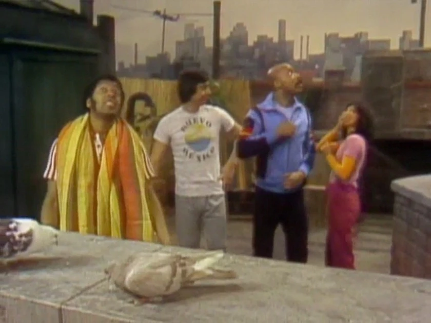 SCENE 1 | On the roof of 123 Sesame Street, Buffy, David, Gordon and Luis are doing some exercises. Suddenly, some thunder blares and they try to go inside, but David discovers the door is locked. |