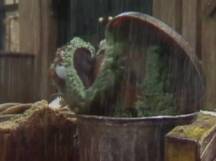 SCENE 4 | Luis has an idea: he takes Bert's pail of dirt and thinks if they pour it onto Oscar's trash can, they will get his attention and bring him upstairs to save them. Oscar is at first annoyed, but then starts using the dirt to make mud pies. |