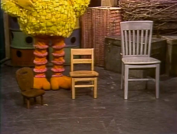 SCENE 1 | Big Bird and Mr. Snuffleupagus pretend to play "Goldilocks and the Three Bears," with Big Bird as the bear family and Snuffy as Goldilocks (wearing his Shirley Temple wig). As Big Bird goes out to simulate the bears walking in the woods, Snuffy-locks tries out all three different-sized chairs, which all break under his weight. Big Bird returns and sees the game worked a little too well - all the chairs were too small for him. Looking at the wreckage, he asks, "You wanna play pick-up sticks?" |