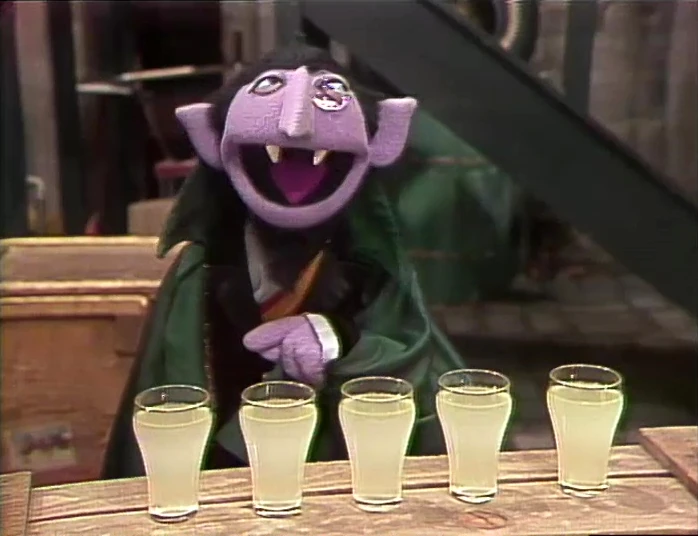 SCENE 4 | Count von Count has set up a lemonade stand. He sets out five glasses and asks the kids which one is different; they pick the one that's half empty. Buffy tops it off so it's the same, then drinks it up. The kids correctly guess that the glass is the different one again and Buffy fills it up once more. The Count then gives the lemonade to the kids. |