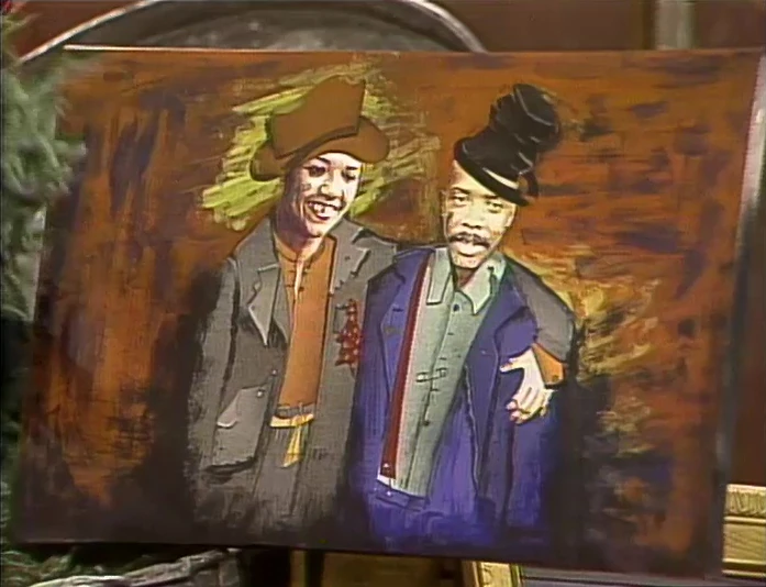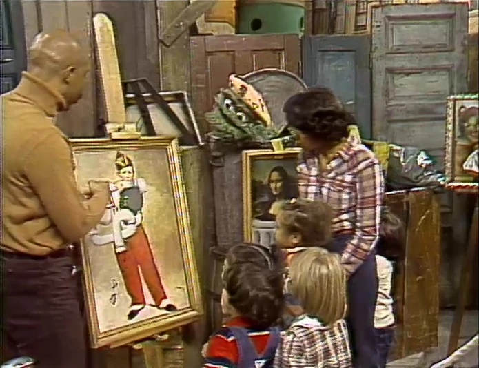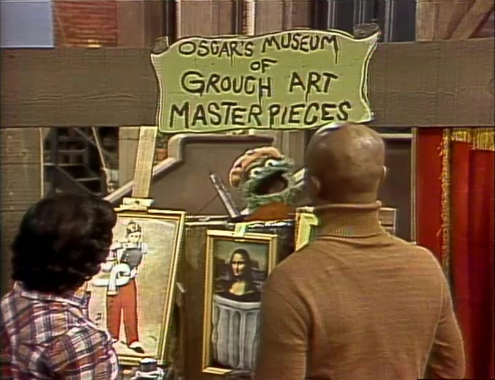 SCENE 3 | Maria, Gordon and the kids see Oscar's trash can area has been transformed into "Oscar's Museum of Grouch Art Masterpieces." The art on display are famous paintings, but Oscar has retouched them all to give them more grouchy appeal. Everyone checks out the works, consisting of a Paul Cézanne still life (with rotten fruit), Hans Holbein's portrait of Henry VIII (with a fish bone in his arm), the Moaning Lisa (sitting in a trash can), and Édouard Manet's The Fifer (with a water pipe instead of the titular fife). Oscar even has his own painting in the collection, Two Silly Hobos (depicting Gordon and Maria as such). |