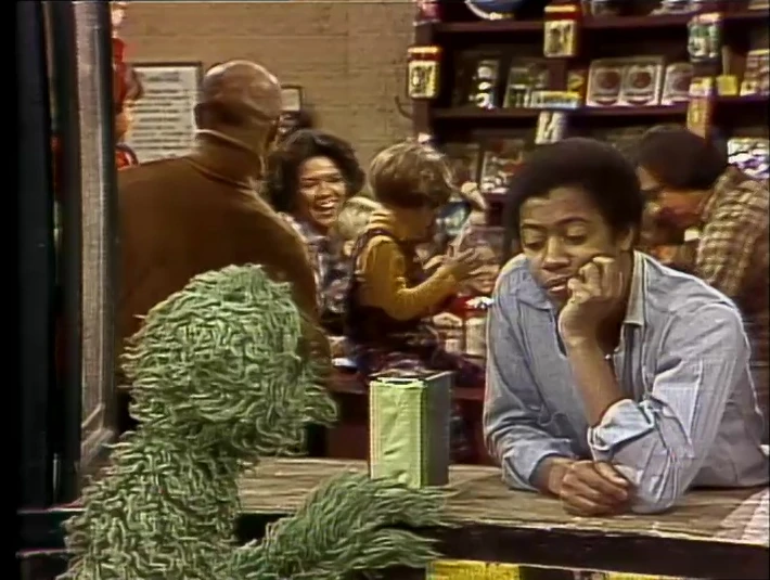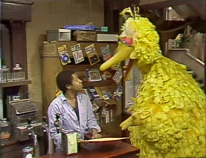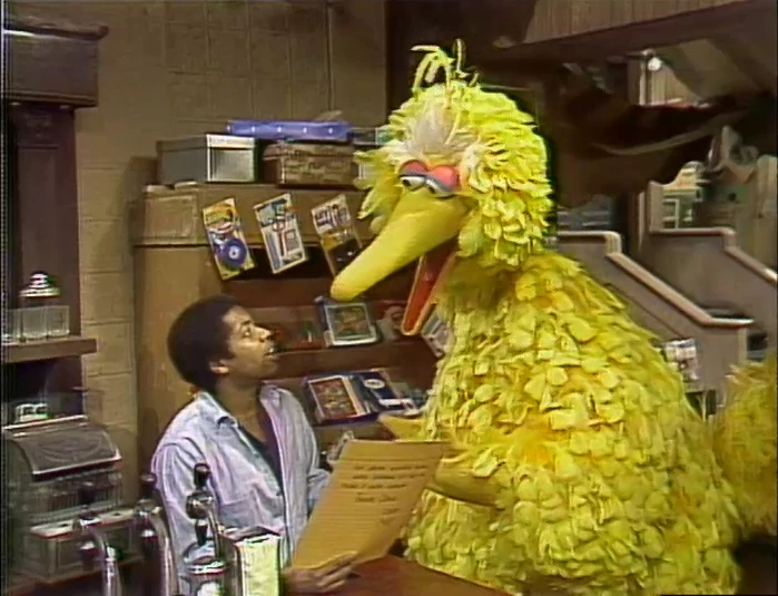 SCENE 5 | David finds a note in Hooper's Store from somebody who visited earlier when he was gone, but they promise to be back later to pick up their lunch order. The note is sign, "Love, ME'." David wonders who the note could be from, but finds more clues in the P.S. sections (plus the back) of the note - the customer wants a big bowl, they don't eat with a spoon and requesting some birdseed sprinkled on top. David realizes the note is from Big Bird, who then enters the store asking if his lunch is ready. David explains that reading the note took so long, he hasn't made the food yet. Big Bird responds, "What's the problem? I said it was from me didn't I??" |