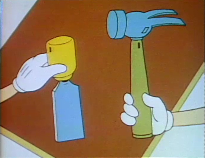 Cartoon | A hammer and chisel cooperate to carve a triangle out of wood, which a pencil uses to draw some. (First: Episode 0932) |
