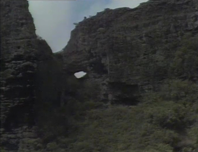 SCENE 3 | Big Bird and Snuffy think they've found the right place until they consult Maria's guide book, discovering it's actually "Mount Hole-in-the-Mountain." Big Bird reads on about the legend of the mountain, claiming that during a spear-throwing competition, a man named Kapunohu ended up piercing directly through it instead. The musical tag for this scene originally heard in its original airing is replaced here with different Hawaiian music. |