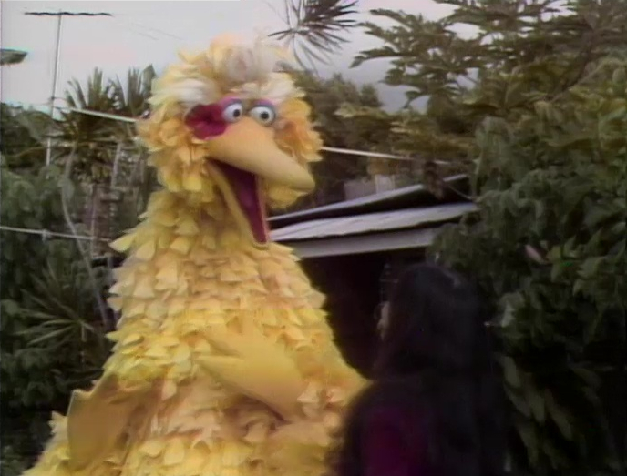 SCENE 9 | In Samson's yard, Big Bird becomes discouraged when Snuffy has to take his nap, leaving him with nothing else to do. Buffy helps him realize that all the time he's spent with Snuffy had meant less time with her, not unlike when she didn't have as much time with Big Bird back when she first brought Cody to Sesame Street. The two enjoy some free time together looking around in the garden, and Buffy gives him a hibiscus flower to wear in his crown of feathers. |