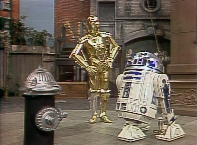| SCENE 4 | C-3PO is all in a tizzy as R2-D2 declares he's fallen in love with somebody on Sesame Street. R2-D2 describes the potential object of his desires as being short, quiet, and with a pointed head. When R2 introduces his friend to "her," C-3PO breaks the news to him that it's not a fellow droid he's attracted to, but a fire hydrant. | |