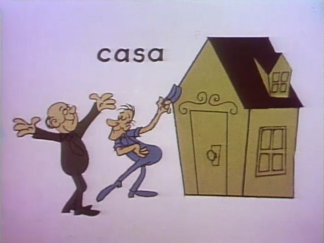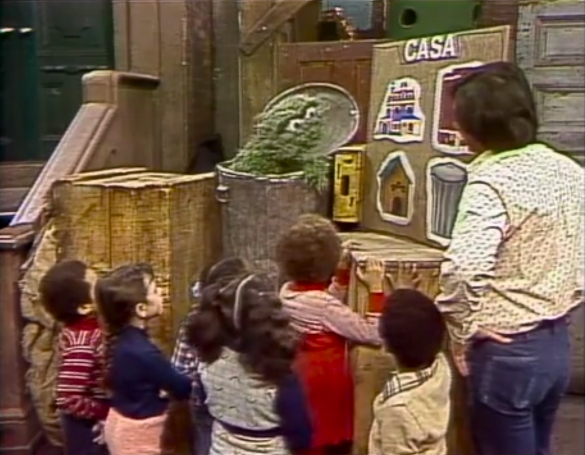 SCENE 3 | Oscar teaches the kids about the Spanish word "CASA." Luis helps by revealing pictures of different casas and the kids guess what kind of homes they are. The final image is of a trash can, which Oscar considers a fine casa for a Grouch. He begins to wax sentimental about his residence as sappy music plays: "A house is just a house, but a trash can is where the heart is. A place to hang my hat, a can to call my own, mi trash can es su trash can. Bless my happy trash can!!" |