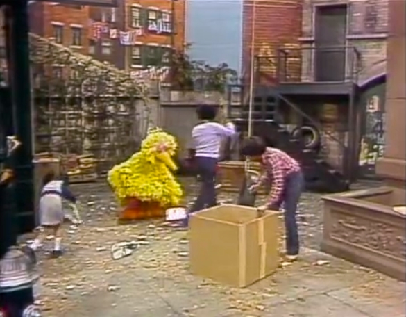 SCENE 6 | A frustrated David sweeps up the area in front of Hooper's Store. He vents to Susan about the street being a mess and he seems to be the only one noticing and doing something about it. He points out Maria reading, Big Bird playing, and Luis working amid the piles of trash, leaves, and wood shavings around them. Susan recommends that he not be upset with his friends as he hasn't told anybody of his problem. Susan brings everyone's attention to the messy street, and soon they all pitch in and start a block-wide clean-up as Mr. Macintosh announces the sponsors. |