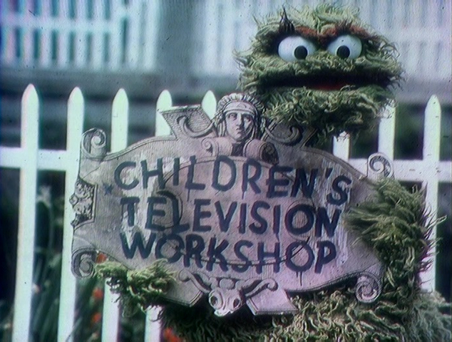 CLOSING SIGNS | Ernie and a kid hold the Sesame Street sign, while Oscar holds the CTW sign. |