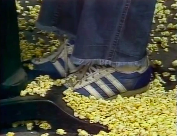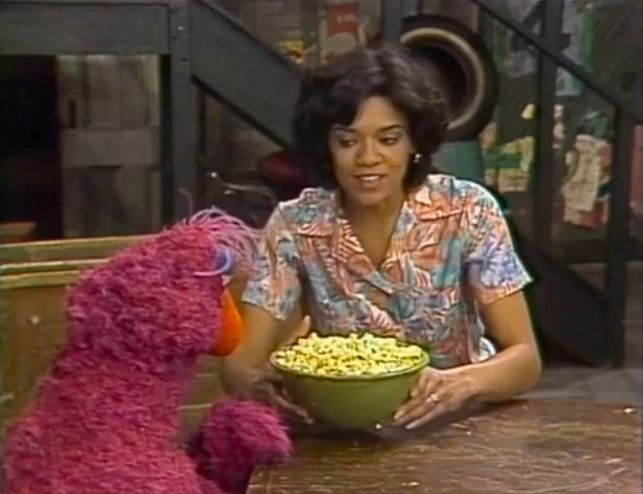 SCENE 2 | Telly Monster wants to explain "on" and "under," but finds it difficult with just words. Maria suggests that he use something to demonstrate, and allows him to use her bowl of popcorn currently on the table. Telly moves the bowl under the table then back on several times, accidentally spilling its contents everywhere. He points out that now the popcorn is on the table, the ground, and Maria's shoes. |