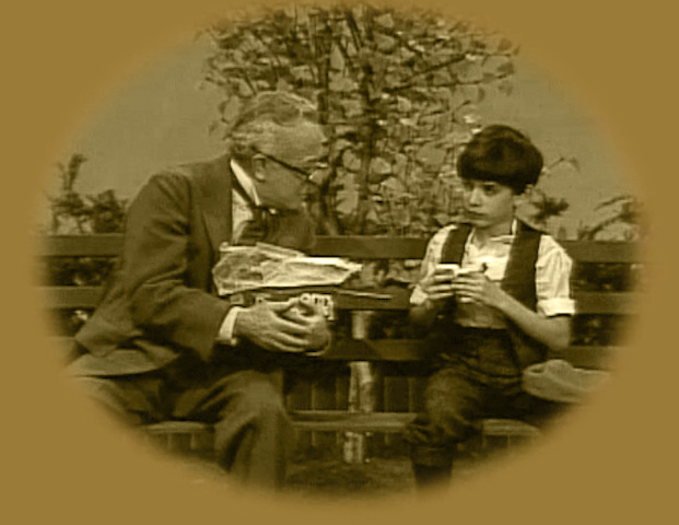He walks out to the sidewalk and vents to the viewer of the importance of eating during mealtime. He remembers as a kid (played by Daniel Rothman) in the 1920s on a day when he was having so much fun roller-skating that he didn't want to stop to eat. His father (played by Will Lee) had made him lunch, which young Harold eventually became tired enough to eat. As he did, he felt his strength returning to him so that he could continue playing. Back in the present, Mr. Hooper is now determined to get everyone to eat, but when he re-enters the Fix-It Shop, he finds everyone eating the sandwiches... and they haven't left any for him. |