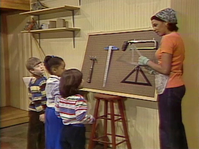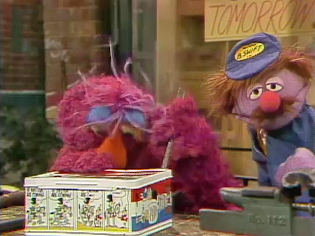 SCENE 1 | Susan, Maria, Mr. Hooper, the kids, and Telly are busy helping Luis get the renovations on the Fix-It Shop done for opening day tomorrow. An Anything Muppet courier (Michael Earl) arrives to deliver something for Luis; Telly signs for it and explains that they're all cooperating today. The order is some new tools that the courier asks Telly to look over on the outside table. The hammer, saw, screwdrivers, and crowbar all belong, but the lunchbox doesn't... it belongs to the courier. He has trouble getting it open, so Telly starts to work on it with the tools provided (to the courier's distress). |