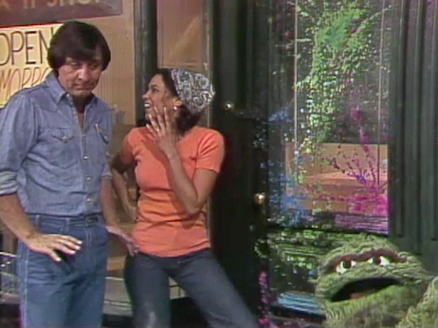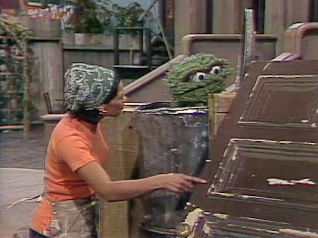 SCENE 4 | Maria and Luis exit the Fix-It Shop, resolved to call it a day as soon as they attach the door to the storefront... except it's missing. Maria spots it over near Oscar's trash can and approaches Oscar for an explanation. Oscar admits that he was going to paint it for them since he's been given so much good trash from the recent makeover of the shop: "I may be a Grouch, but I do have a heart." Slightly suspicious of his well-intentioned gesture, Maria says he can go ahead and paint it, and heads back to Luis. |