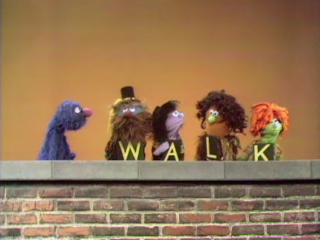 Muppets | Grover: Monotones Walk Part 1 — Grover asks Little Jerry and the Monotones to hold up a sign that spells WALK. (First: Episode 0221) |