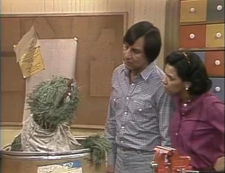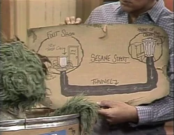 SCENE 2 | Maria and Luis admire their new, spacious shop, then hear the sound of drilling, followed by a familiar voice. Suddenly, an explosion occurs from within the store's trash can and Oscar flies out, followed by trailing rubble. He re-emerges from the can and explains that he's just dug an underground tunnel from his can to the store's can, showing them the construction plans. Maria and Luis complain about the mess, which is also a part of his plan. |