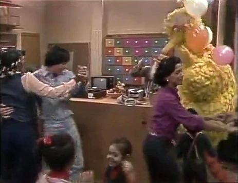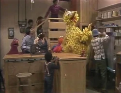 SCENE 1 cont'd | The film ends rather abruptly and Big Bird wonders where the happy ending is. David turns on the lights, revealing the true happy ending - the fully refurbished Fix-It Shop! |